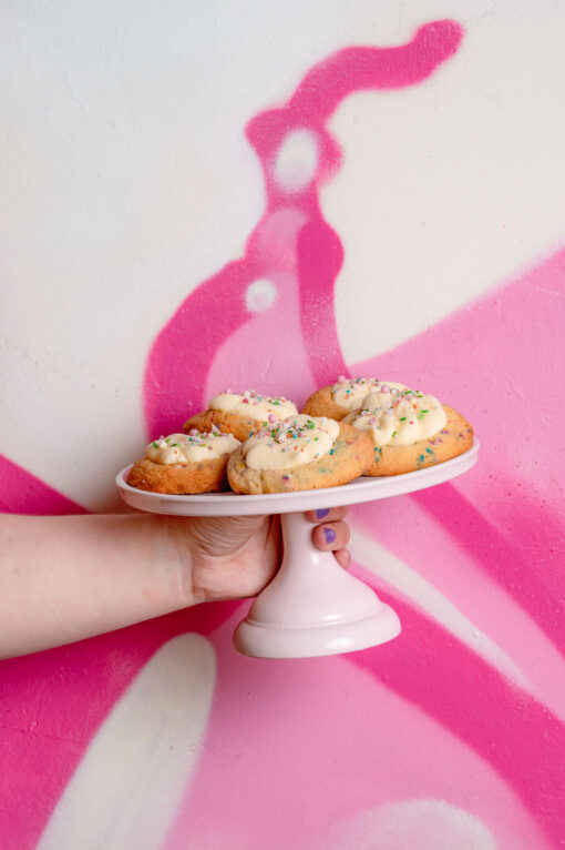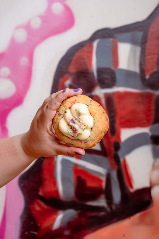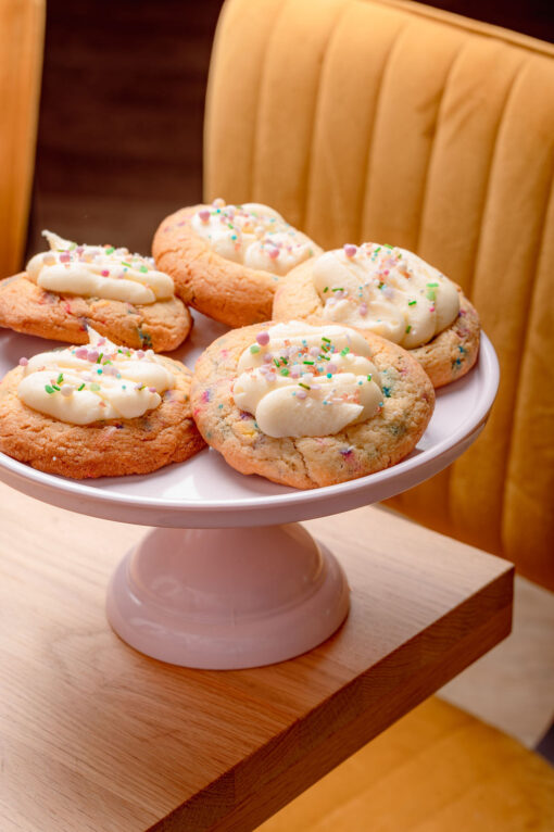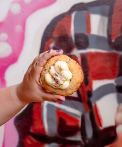 Onze Birthday Crumble Cookie is een feestje op zichzelf! Deze extra grote, chewy cookie zit boordevol vrolijke sprinkles en vanille, en heeft die herkenbare huisgemaakte crumble van The Blueberry.